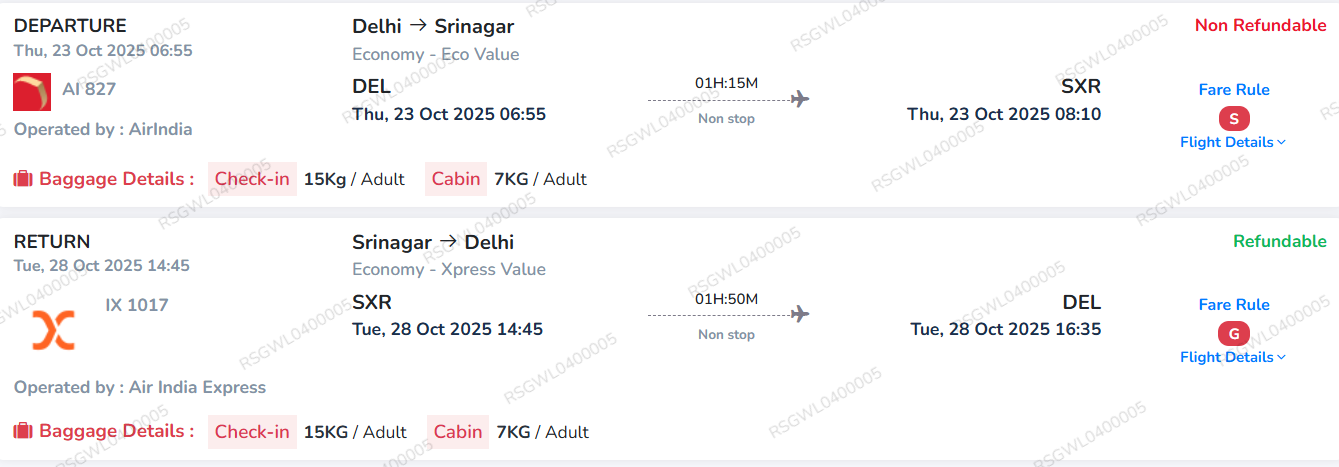 Air Fare - Delhi - Srinagar - Delhi