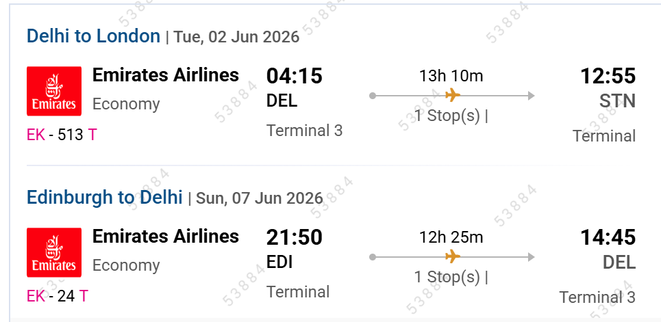 Airfare from Delhi London, Edinburgh to Delhi
